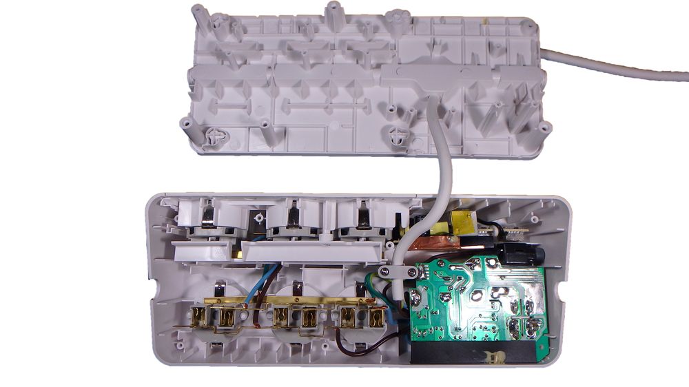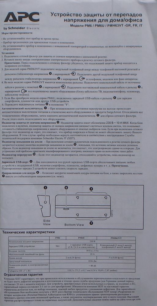 Как обычно, знакомство начинаем с упаковки. На ней содержится вся необходимая информация на русском языке. Достаточно изучить ее в течение 5 минут, и вы без помощи продавца-консультанта будете иметь представление о возможностях и назначении данного фильтра. ![]() ![]() После распаковки перед нами оказывается сетевой фильтр и инструкция на нескольких языках, включая русский. ![]() Корпус PM6U-RS выполнен из белоснежно-матового пластика, устойчивого к появлению царапин. Пыль на нем практически незаметна. Розетки имеют защитные шторки, что положительным образом сказывается на безопасности, если к фильтру имеют доступ дети. ![]() Розетки не только расположены под разным углом, но и имеют разное расстояние между собой, что позволяет без проблем подключать большие блоки питания. ![]() ![]() На левом торце находится кнопка сброса автомата защиты. После возникновения нештатной ситуации и устранения ее причин, достаточно нажать кнопку и фильтр снова готов к работе. ![]() На передней панели находятся индикатор исправности защиты, индикатор заземления и индикатор перегрузки, в случае срабатывания которого необходимо отключить лишнюю нагрузку. ![]() ![]() Два USB-порта, находящихся на передней панели, также обеспечивают защиту подключенных к ним устройств. ![]() Номинальное входное напряжение - 230В Время реакции - 1 нс Суммарная мощность нагрузки - 2.3 кВт Максимальный ток нагрузки - 10А Максимальный ток помехи, поглощаемый ограничителем - 24 кА Кол-во выходных розеток - 6 розеток евростандарт с заземлением Порты USB - 2 порта USB; максимальная суммарная сила тока 2.4А Максимальная энергия входного импульсного воздействия - 1836 Дж Степень подавления высокочастотных помех - 40 дБ Предохранители - термопрерыватель Размеры (ширина x высота x глубина) - 272 x 62 x 110 мм Вес - 0.69 кг Отличительной особенностью PM6U-RS является наличие USB-портов, им мы и уделим особое внимание. ![]() В качестве теста мы поставим на зарядку устройства и измерим ток заряда, а также напряжение, выдаваемое USB-портами PM6U-RS. Для этого мы воспользуемся планшетом Apple iPad 4 (11560 mAh) и внешним аккумулятором Stream Energy VP 034 (7800 mAh). Измерения будем проводить с помощью двух тестеров USB Charger Doctor. Пределы измеряемого напряжения - 3.5В - 7.0В, тока до 3А. ![]() ![]() При одновременном подключении значения составили 1,67А. и 0,85А., что в сумме дает значение даже больше указанного производителем. Отличный результат. ![]() ![]() ![]() ![]() Ток заряда составил 0,87А, больше не позволяет контроллер самого устройства, для него это максимальное значение. ![]() В тестах PM6U-RS показал себя отлично, теперь переходим к вскрытию. ![]() ![]() По качеству изготовления никаких претензий нет - все собрано на очень высоком уровне. ![]() В фильтре используется многожильный медный кабель диаметром 2,1мм, который легко держит ток до 20А. Если учесть, что максимальный ток нагрузки, указанный производителем, составляет 10А, то такой запас надежности не может не радовать. Заключение Подводя итог, хочется отметить, что в APC SurgeArrest PM6U-RS продумана буквально каждая мелочь. Он отлично будет смотреться и в офисе, и дома, а главное: можно быть твердо уверенным, что он защитит подключенные к нему устройства. Слияние с компанией Schneider Electric никак не отразилось на качестве, и спустя десять лет APC является синонимом качества и надежности. AVA