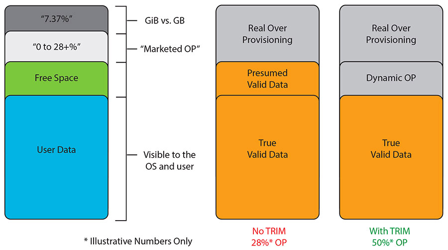 Рынок SSD развивается семимильными шагами — наличием твердотельного накопителя в составе системного блока вряд ли кого удивишь. Производители наперебой советуют нам те или иные новые девайсы, новые контроллеры, новые фишки и оптимизации, подталкивая пользователя к покупке именно их девайсов. Один из инструментов влияния — скоростные показатели накопителя, которые в случае использования SATA-накопителя упираются в пропускную способность интерфейса, а в случае использования NVMe накопителя — в возможности контроллера и массива памяти SSD. Сегодня нам бы хотелось поговорить о нескольких вещах, влияющих сразу и на производительность, и на стабильность скоростных характеристик, и на срок службы накопителя. Речь идет о резервной области накопителя и о том, какие чудеса и полезные фишки несет ее изменение. Скажем прямо: тема — не нова, существует со времен возникновения твердотельных накопителей, и многое взято из разных источников интернете. Основная же идея в любом случае одна: как резервная область влияет на показатели SSD. ![]() Что такое резервная область SSD? Ни для кого не будет открытием, что операционные системы никогда не распознают полный объем твердотельного накопителя. Резервная область на твердотельном накопителе скрыта от глаз пользователя и используется под нужды SSD: она доступна только контроллеру самого накопителя. Нужды контроллера могут быть разнообразными, однако сводятся к двум важным вещам: использованию под кэш и резерв для замены битых или изношенных ячеек. Рассмотрим обе ситуации отдельно. Резервная область для кэша Резервная область может использоваться накопителем для ускорения записи в NAND, путем создания буфера SLC-кэша из доступного массива NAND. В результате скоростные характеристики накопителя при использовании режима SLC-кэширования выше на операциях чтения/записи, но лишь в пределах выделенной под кэш области, как правило, фиксированной на уровне прошивки контроллера. После исчерпания доступного кэша пользователь неизбежно столкнется с падением производительности SSD. Особенно ярко это видно при использовании накопителей с TLC или 3D TLC NAND, где скоростные характеристики самой NAND в силу ее конструктивных особенностей ощутимо ниже, чем у собратьев на MLC NAND и ее вариациях. ![]() Резервная область для продления жизни SSD У всех твердотельных накопителей есть показатель под названием TBW, указывающий фактический ресурс перезаписи ячеек. Иными словами — сколько раз пользователь может записывать и считывать данные на SSD. Ресурс обычно выражен значением в терабайтах (TB), соответственно, чем выше это значение, тем выше вероятность того, что SSD проживет дольше. Тем не менее, это не отменяет два факта: SSD может внезапно умереть из-за отказа контроллера или из-за сбоя питания от некачественного блока питания ПК, в результате фактических отказов микросхем NAND. Задумывались ли вы когда-нибудь, почему у определенных накопителей указан один объем TBW, а у других, той же емкости — совершенно другой, причем разница бывает и двукратной? Ответ кроется в пределах рассматриваемой нами проблематики, а именно — в размере резервной области накопителя. Если резервная область накопителя больше, то и дополнительных ячеек на замену изношенных или битых будет больше, соответственно и оперировать ими контроллер сможет до их фактическог